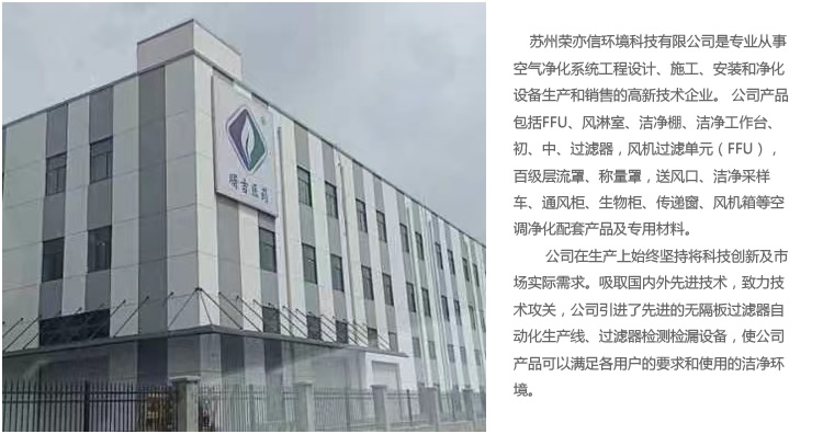 蘇州榮亦信環(huán)境科技有限公司是專業(yè)從事空氣凈化系統工程設計、施工、安裝和凈化設備生產和銷售的企業(yè)。 公司產品包括FFU、風淋室、潔凈棚、潔凈工作臺、初、中、過濾器,風機過濾單元(FFU),百級層流罩、稱量罩,送風口、潔凈采樣車、通風柜、生物安全柜、傳遞窗、風機箱等空調凈化配套產品及專用材料。公司在生產上始終堅持將科技創(chuàng)新及市場實際需求。吸取國內外先進技術,致力技術攻關,公司引進了先進的無隔板過濾器自動化生產線、過濾器檢測檢漏設備,使公司產品可以滿足各用戶的要求和使用的潔凈環(huán)境。公司擁有技術專業(yè)的科技人員,專業(yè)的設備制作人員,工程安裝施工人員,我公司不斷創(chuàng)新,不斷發(fā)展,致力于空調凈化系統的新設備、新技術的研發(fā)和生產。